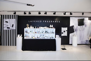會場佈置以簡約的黑白色爲主調,簡潔地陳列出 LAYERED FRAGRANCE 的多款人氣產品,盡顯品牌低調奢華的感覺。 當中再根據香味類別劃分成多個小專區,包括:花香味、果香味、獨特的酒香味等,讓顧客可從不同的專區挑選出心儀的香味。